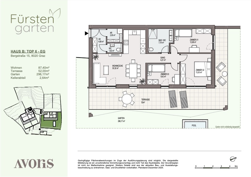 Mit ca. 87,4 m² Wohnfläche, vier Zimmer, gesamt 52 m² großen Terrassen und einem Gartenanteil von rund 296 m² bietet Top 6 ideale Voraussetzungen für Familien oder Paare mit Platzbedarf.